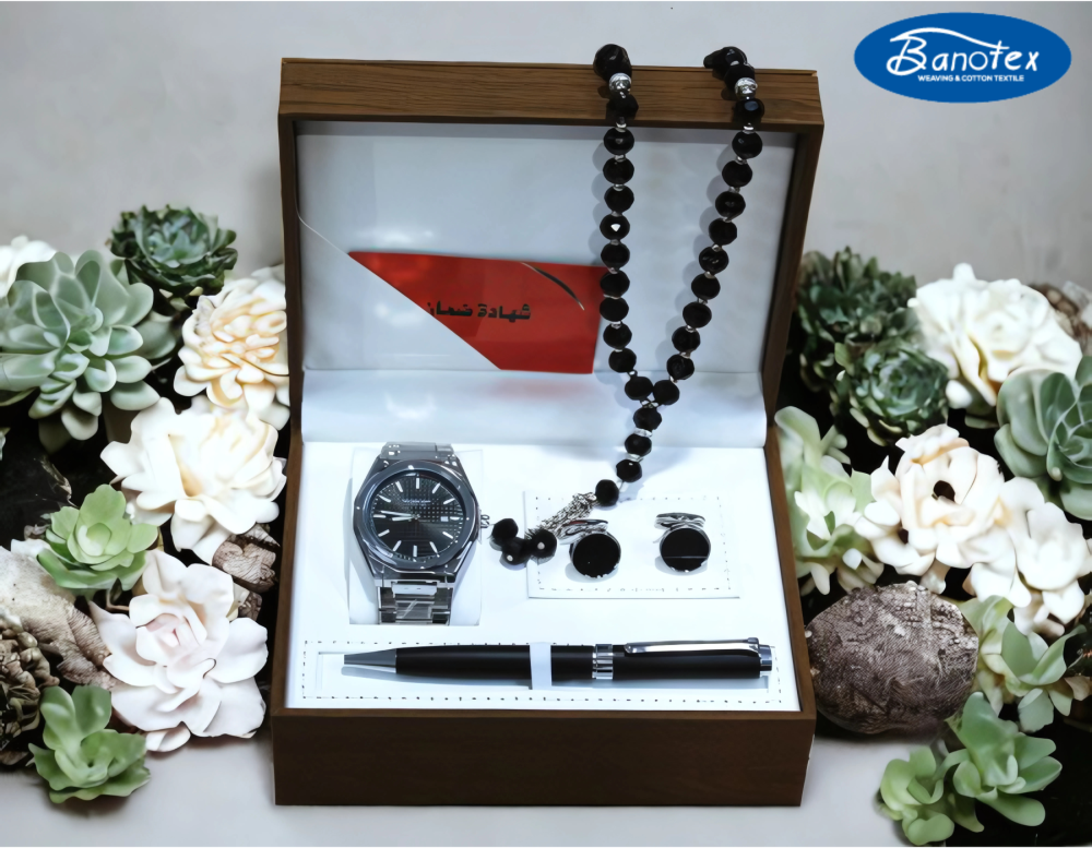 ساعة هدية | طقم ساعة رجالية من 4 قطع ساعة يد مع قلم و أزرار و مسبحة | هدية مميزة